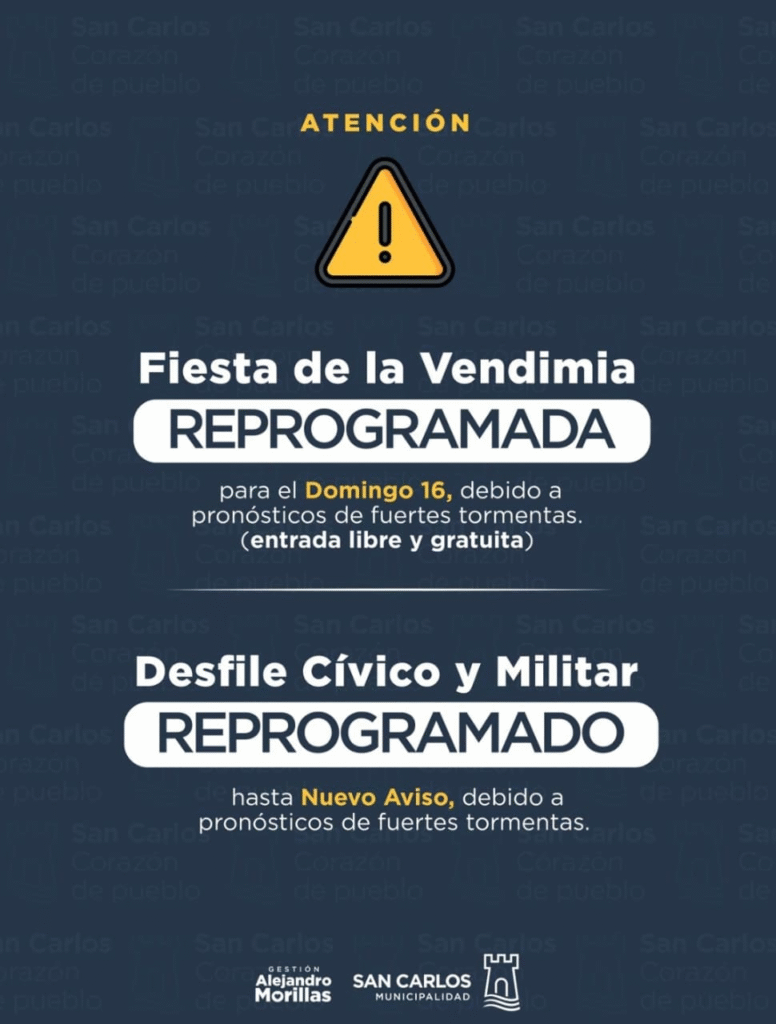 Según el comunicado oficial, la Fiesta de la Vendimia fue reprogramada para el domingo 16, manteniendo la entrada libre y gratuita para todo el público.
