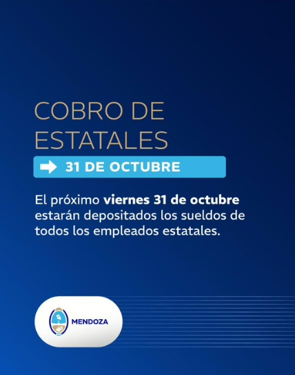 El Gobierno de Mendoza informó que el próximo viernes 31 de octubre estarán depositados los sueldos correspondientes a todos los empleados estatales de la provincia.