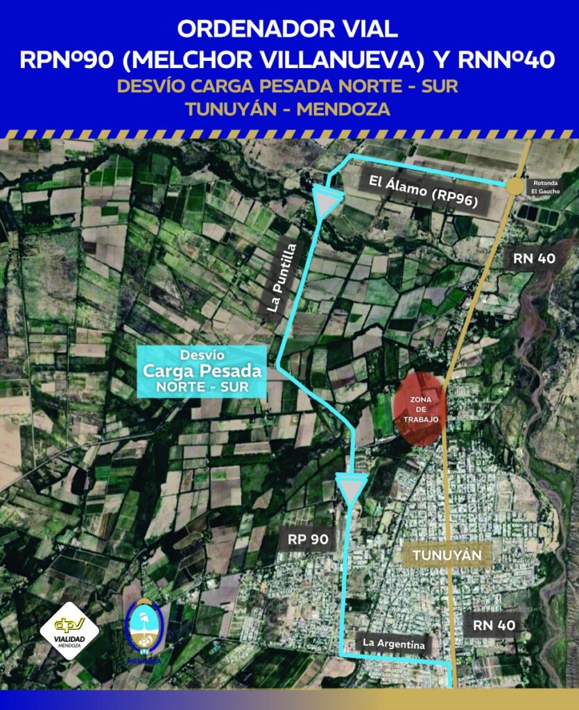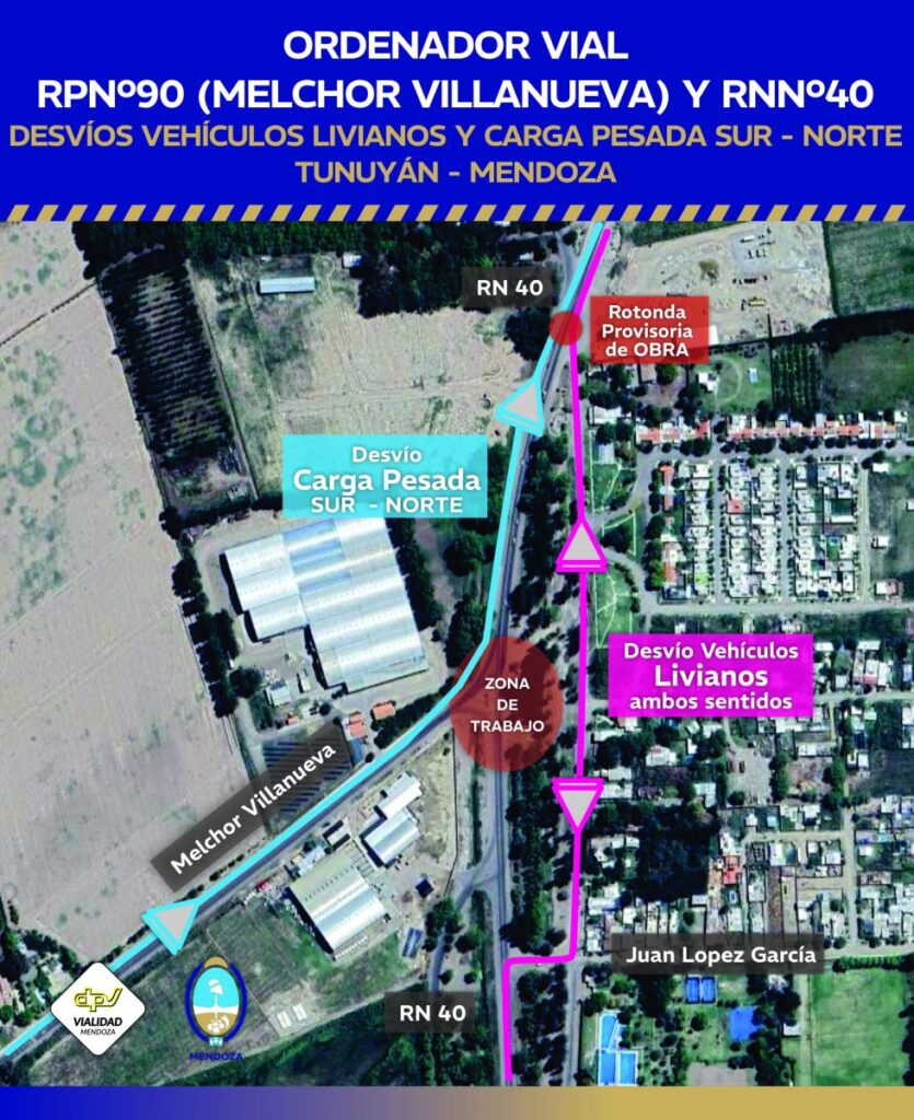 En cambio, los vehículos de carga pesada que circulen por la RN 40 de sur a norte sí continuarán pasando por la zona de obra, pero por un leve desvío demarcado sobre la banquina oeste de la RN 40 y Melchor Villanueva. Para llegar a este punto desde el sur de la RN 40, deberán girar por calle La Argentina, luego por RP 90 y después por Melchor Villanueva hasta el desvío de la obra.