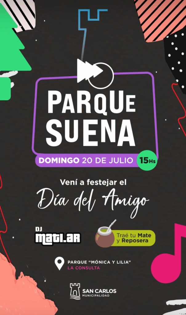 Este domingo desde las 15, la Municipalidad de San Carlos llevará a cabo el evento Parque Suena. Donde los vecinos del departamento podrán disfrutar de actividades al aire libre para festejar el Día del Amigo.